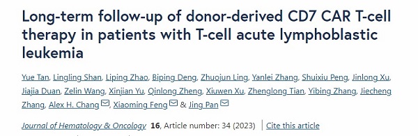4月5日,接纳雅科生物科技的CD7 CAR-T细胞医治手艺,由北京高博博仁病院的潘静主任团队对医治的T细胞白血病患者停止了长达2年的随访,这一主要的临床成果颁发在着名学术期刊《Journal of Hematology & Oncology》(影响因子23.168)上:Long-term follow-up of donor-derived CD7 CAR T-cell therapy in patients with T-cell acute lymphoblastic leukemia1。