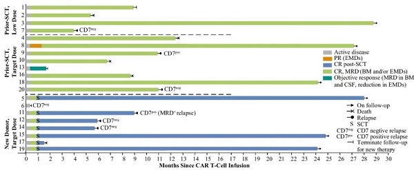 CD7 CAR T细胞是一种新型的癌症免疫医治方式,它可以或许经由过程基因润色T细胞使其可以或许辨认和进犯抒发CD7的癌细胞,在医治CD7阳性的T细胞恶性肿瘤和急性髓系白血病(AML)上具备很大的潜力。在先前的一项I期实验报告中,供体来历的CD7定向嵌合抗原受体(CAR)T细胞在难治或复发的T细胞急性淋巴细胞白血病(r/r T-ALL)患者中显现出可行性和初期疗效2。在此,咱们报告了该疗法在2年随访后的持久宁静性和疗效。