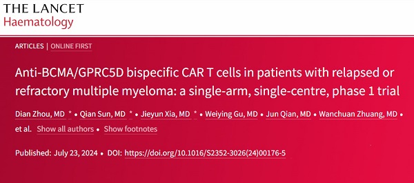 7月23日,接纳上海雅科生物科技无限公司研发的BCMA/GPRC5D双特异CAR-T细胞医治手艺 (YK-BCMA-GPRC5D BoomTM, YK-CAR-069),由徐州医科大学血液病研讨所医疗团队停止I期临床实验的研讨功效在国际着名期刊颁发:Anti-BCMA/GPRC5D bispecific CAR T cells in patients with relapsed or refractory multiple myeloma: a single-arm, phase 1 trial, The Lancet Haematology (Impact factor: 15.4)。徐州医科大学血液病研讨所徐开林传授、李振宇传授,复旦大学性命迷信学院兼职传授/上海雅科生物科技无限公司CEO张鸿声传授为本文配合通信作者,徐州医科大学血液病研讨所的周典博士、孙乾博士和夏洁云博士为文章的配合一作。