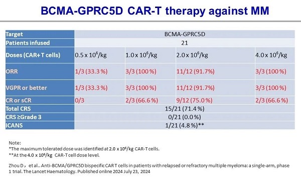 此项临床实验初次接纳国际抢先的BCMA/GPRC5D双特异CAR-T细胞医治手艺,胜利医治了21例R/R MM患者,并取得总减缓率 (ORR) 86% (18/21)的优良疗效。在回输最优剂量,2 x 106/kg的12名患者中,ORR为91.7% (11/12),CR/sCR到达75% (9/12),VGPR为16.7% (2/12)。